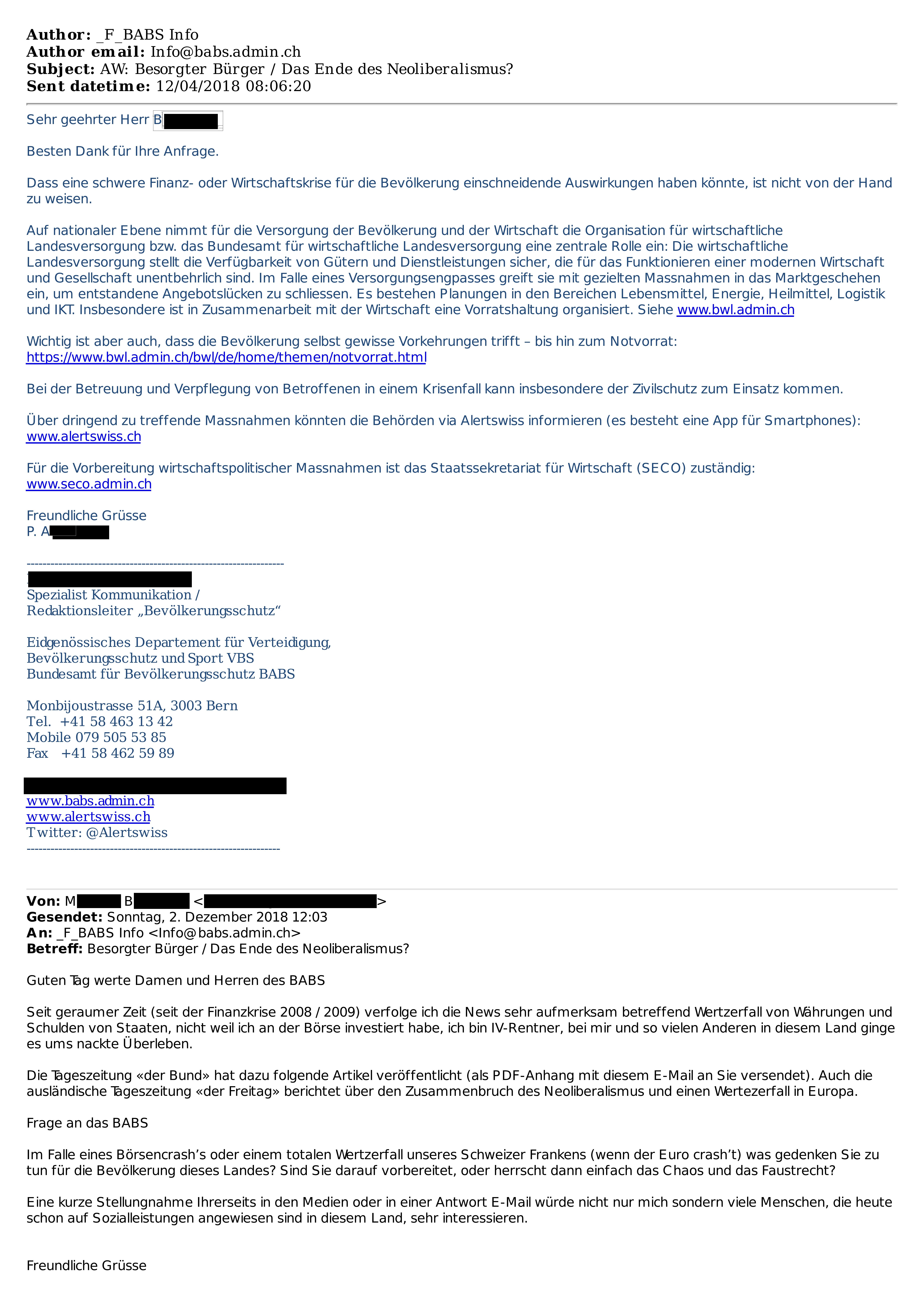 Am Sonntag dem 2. Dezember 2018 / 12:02 Uhr habe ich folgenden E-Mail Inhalt an das Bundesamt für Bevölkerungsschutz (BABS) abgesendet mit nachfolgenden fünf (5) PDF-Anhängen über die Wirtschaftslage in Europa und den USA aus verschiedenen Tageszeitungen wie „der Bund“ und der Deutschen Tageszeitung „der Freitag“.